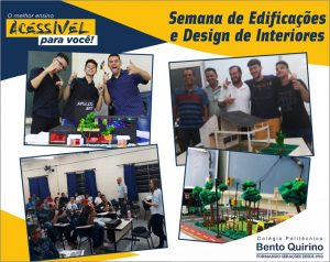 Durante a semana os alunos dos cursos técnicos de Edificações e Design de Interiores, manhã e noite, tiveram a oportunidade de enriquecer ainda mais seu conhecimento com a presença de importantes profissionais do mercado. Os convidados debateram e expuseram a realidade de temas pertinentes à área da construção civil. A programação da Semana de Edificações e Design de Interiores contou ainda com exposição de maquetes e projetos desenvolvidos pelos próprios alunos. “A cada ano o nível dos trabalhos aumenta e isso mostra que o colégio aplica de forma profissionalizante os conteúdos práticos, graças a competência de nossos professores e o esforço de nossos alunos”, comentou o coordenador dos cursos, Tiago Esteves.